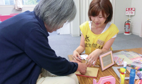 2017年は5日間の活動日程で、昨年と同じ岩手県へ。今年も「笑顔」がテーマでした。岩手の方々と一緒に笑い合えるイベントの企画・運営に、13人の仲間と取り組みました。実施したのは、東海地方のおやつ「鬼まんじゅう」「ういろう」の調理&会食、フォトフレームづくり、ドミノなど。私は副リーダーとしてボランティアチームを支えながら、「岩手の方々に笑顔を届ける」という目標が達成できるよう努めました。今年も行く先々で歓迎していただき、みなさんと交流を深め、たくさんのパワーを受け取りました。高校生の頃までは地元だけが活動範囲でしたが、大学生になって東北でボランティアに励み、その地域の方々と心を通わせ合い、自分を取り巻く世界が大きく広がったと感じています。