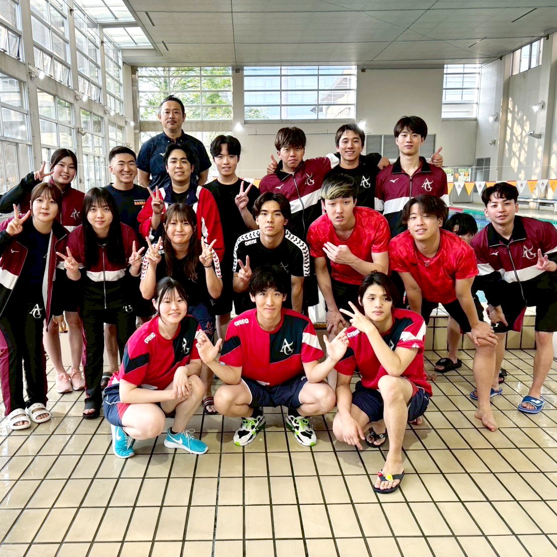 中部学生選手権団体権獲得、日本学生選手権出場を目標にショート・ミドル・ディスタンス・ブレストに分けて個々の専門に合った練習方法を取り入れています。swimだけでなく週2のウエイトも行っています。