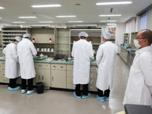 将来医療系の仕事に従事したいと希望がある扇台中学校の6名が、薬学部医療薬学科に上級学校訪問として来てくれました。薬学部の説明や薬学部棟内案内、薬剤学講座 上井優一准教授の指導の下、処方箋(模擬)をもとに調剤をしました。初めて着る白衣に少し戸惑っている中学生もいましたが、初めての体験を楽しんでいました。また、アンケートから「薬剤師にさらに興味を持った」や「将来の進路選択について役立った」、「大学のことが知れてよかった」などの声があり、今後の夢のお手伝いができたかと思っています。