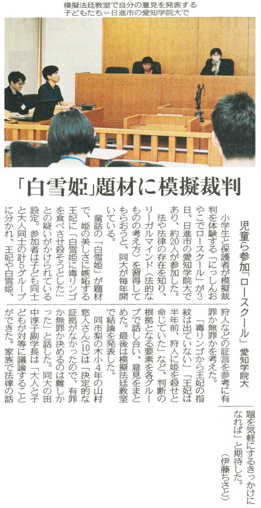 | タイトル | 「白雪姫」題材に模擬裁判 児童ら参加「ロースクール」愛知学院大 |