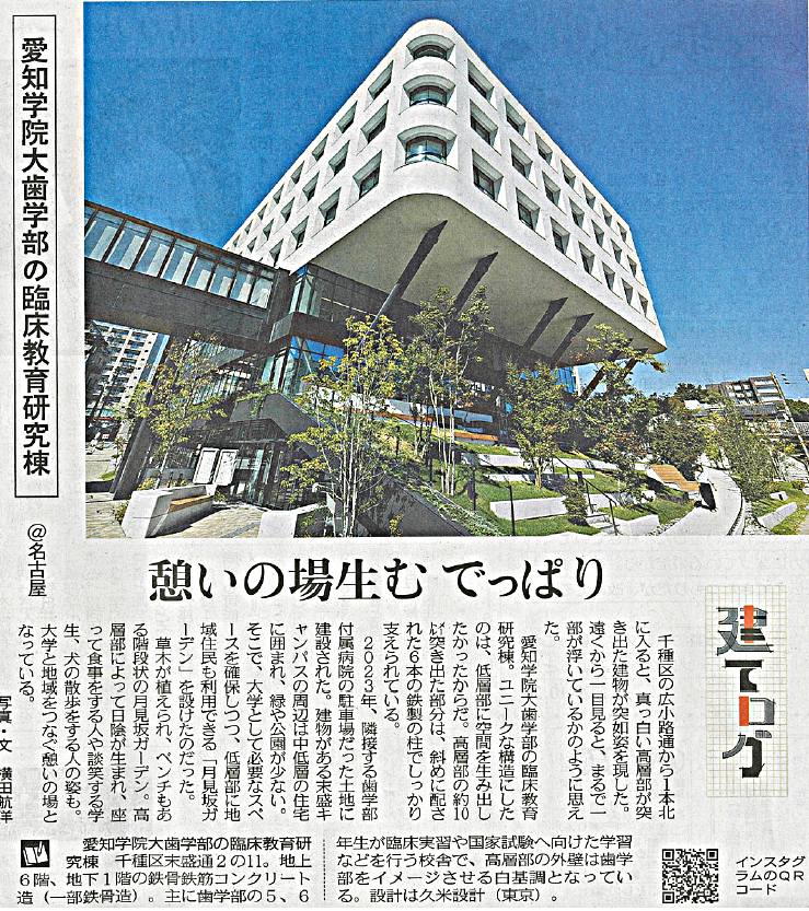 ニュース&イベント 「中日新聞」掲載(10/26) 歯学部臨床教育研究棟 「建てログ 憩いの場を生むでっぱり」 2025/10/29 メディア 掲載日 2025年10月26日(日) メディア 中日新聞 朝刊 14面 タイトル 建てログ 憩いの場生むでっぱり ※クリックすると拡大版をご覧いただけます。 【許諾番号】20251028-33007 この記事・写真等は、中日新聞社の許諾を得て転載しています。 歯学部