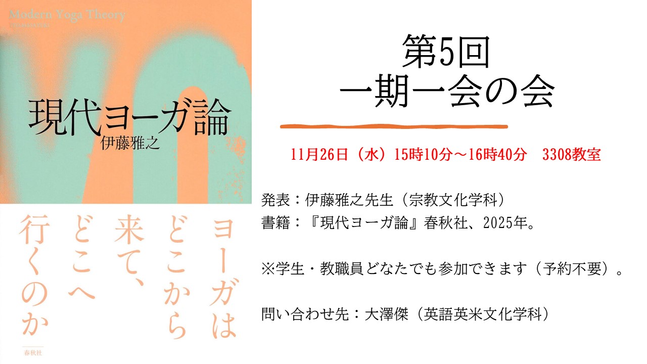 ニュース&イベント 第5回一期一会の会(11/26) 2025/11/19 EVENT 伊藤雅之『現代ヨーガ論』春秋社、2025年 第5回一期一会の会を開催します。今回は『現代ヨーガ論』(春秋社、2025年)を執筆された伊藤雅之教授にお話しいただきます。 どなたでも参加できますので、奮ってご参加ください。 日 時 2025年11月26日(水)15時10分~16時40分 会 場 3号館3308教室 対象者 どなたでも参加できます。 お問合せ先 文学部英語英米文化学科 大澤傑 英語英米文化学科