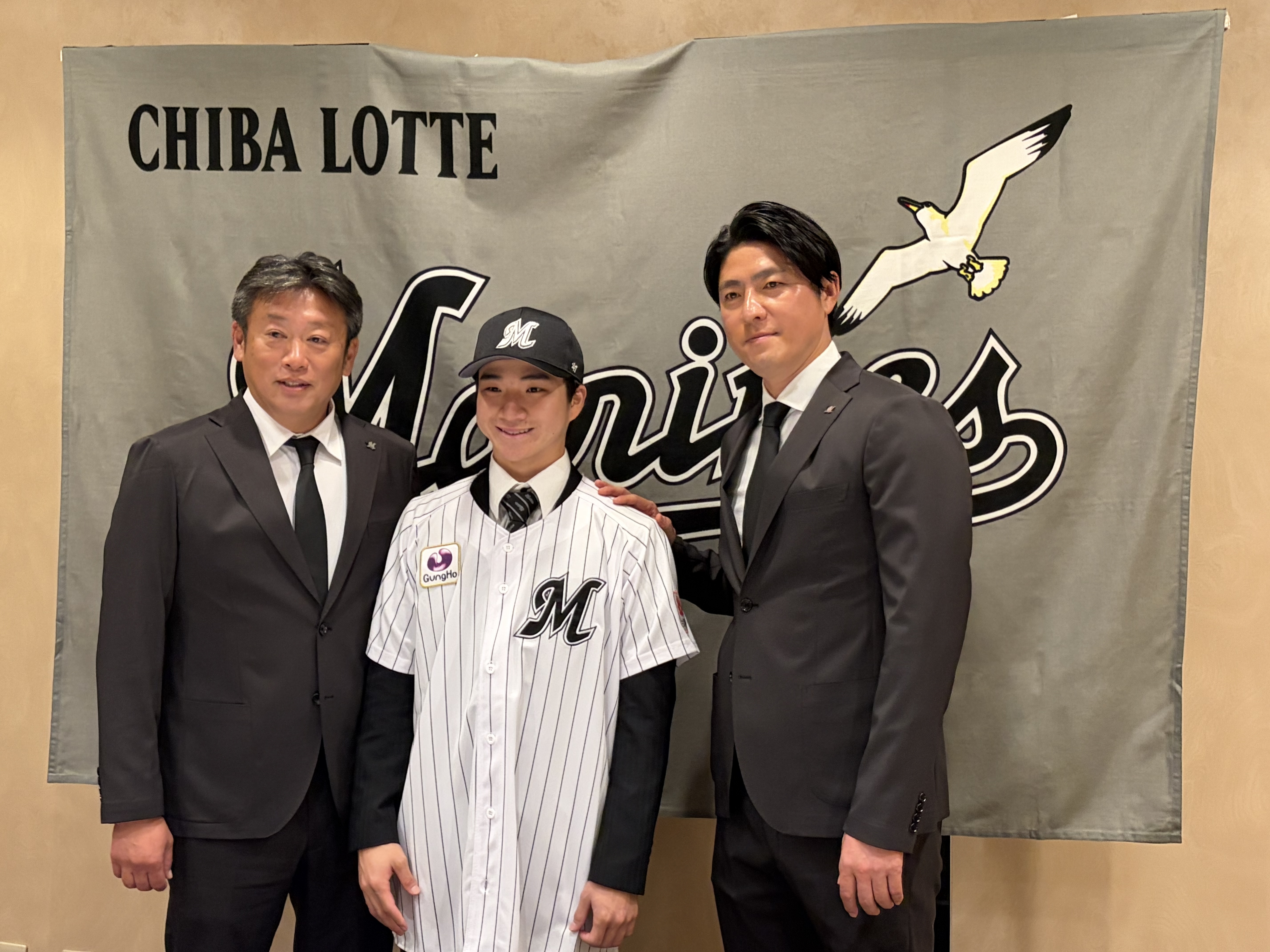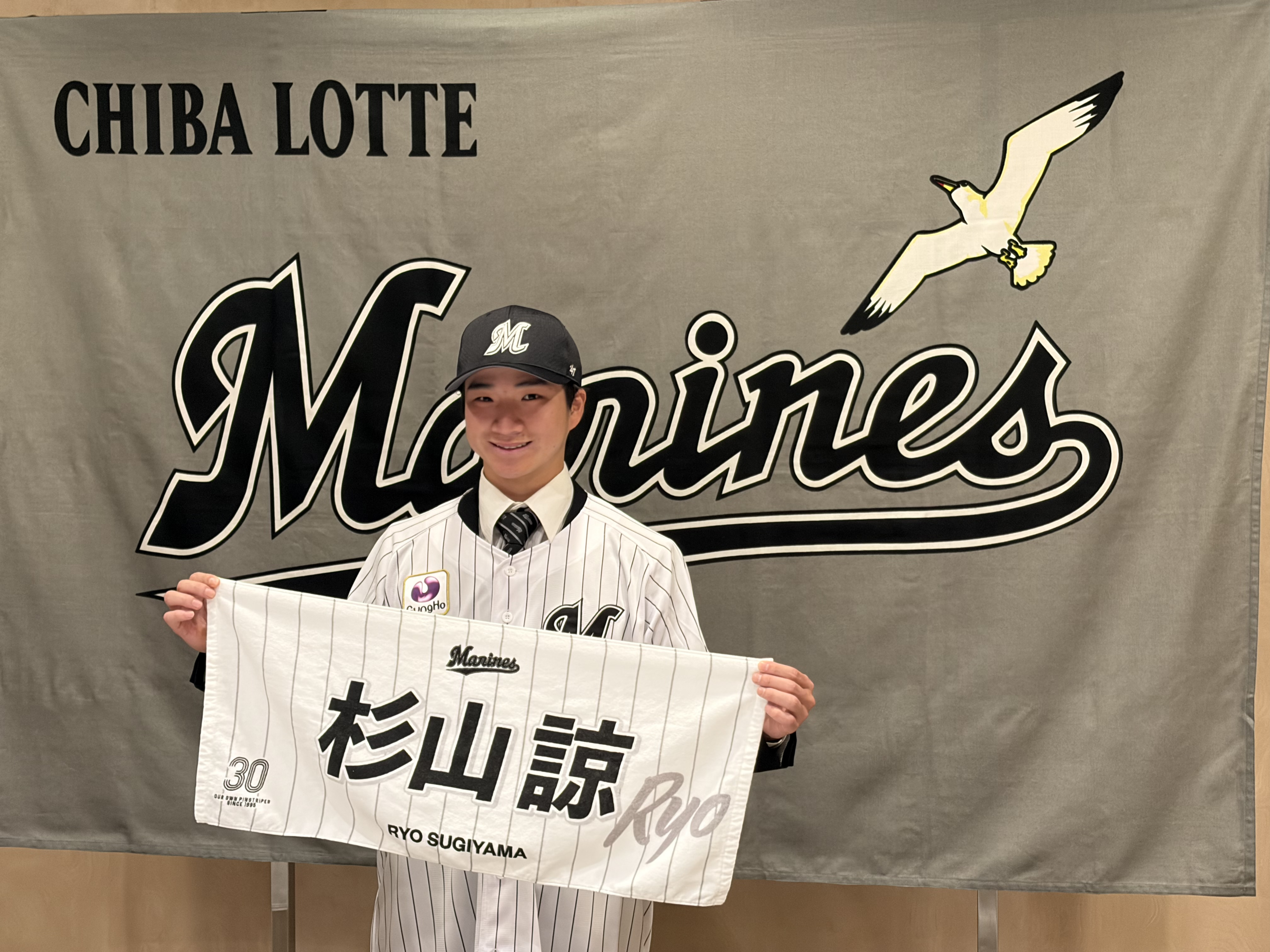 ニュース&イベント 【硬式野球部】杉山諒選手が千葉ロッテマリーンズと仮契約を結びました 2025/11/24 クラブ プロ野球ドラフト会議2025にて千葉ロッテマリーンズより育成3位指名を受けた杉山諒選手(心理学部4年)が11月14日(金)に名古屋市内のホテルで仮契約を結びました。 仮契約を終えて「自分の強みである足を使ったプレーで魅了したい。夢はずっと好きで憧れの藤原恭大選手と1・2番を打つこと。今後は活躍するために体づくりに取り組んでいきたい」と力強い意気込みを寄せました。 来シーズンの千葉ロッテマリーンズ杉山諒選手の活躍にご期待ください。 今後とも応援のほどよろしくお願いいたします。 スポーツ振興室