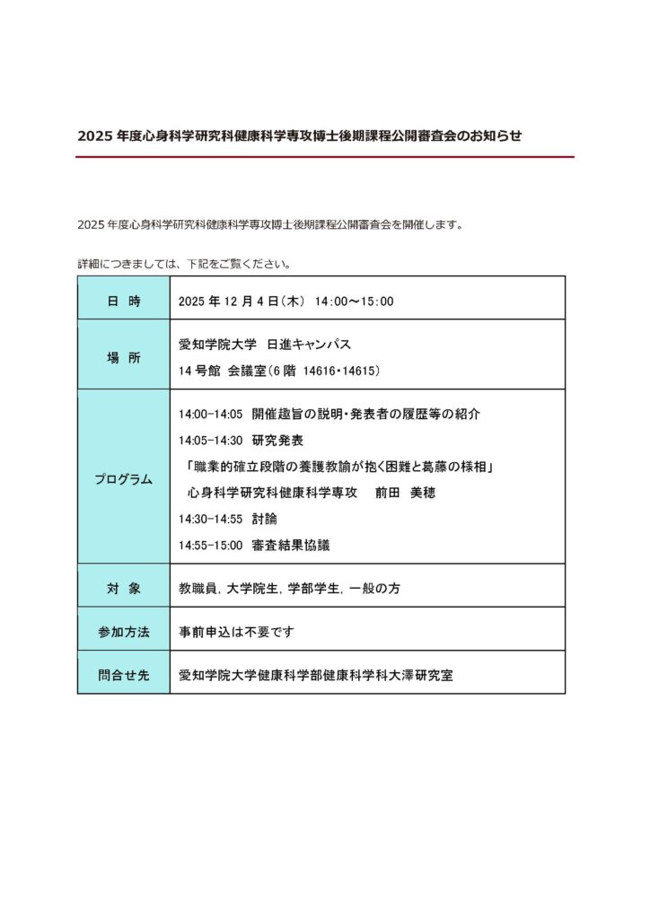 2025年度心身科学研究科健康科学専攻博士後期課程公開審査のお知らせ(12/4)