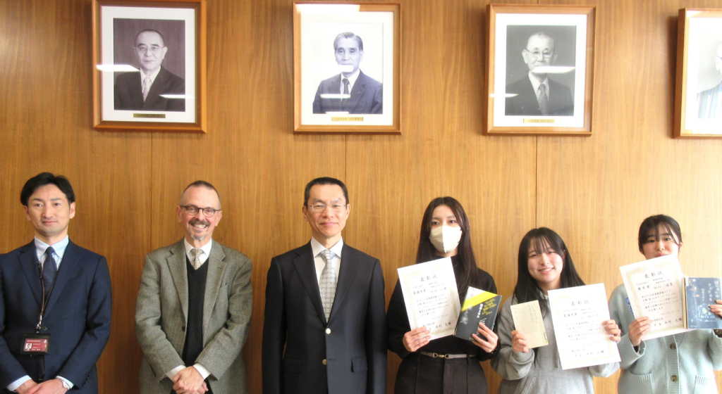 入賞者は12月12日(金)木村文輝学長より表彰状と賞品(図書カード及びAGUグッズ)を贈呈しました。