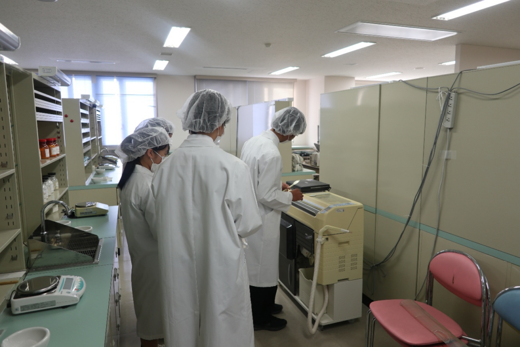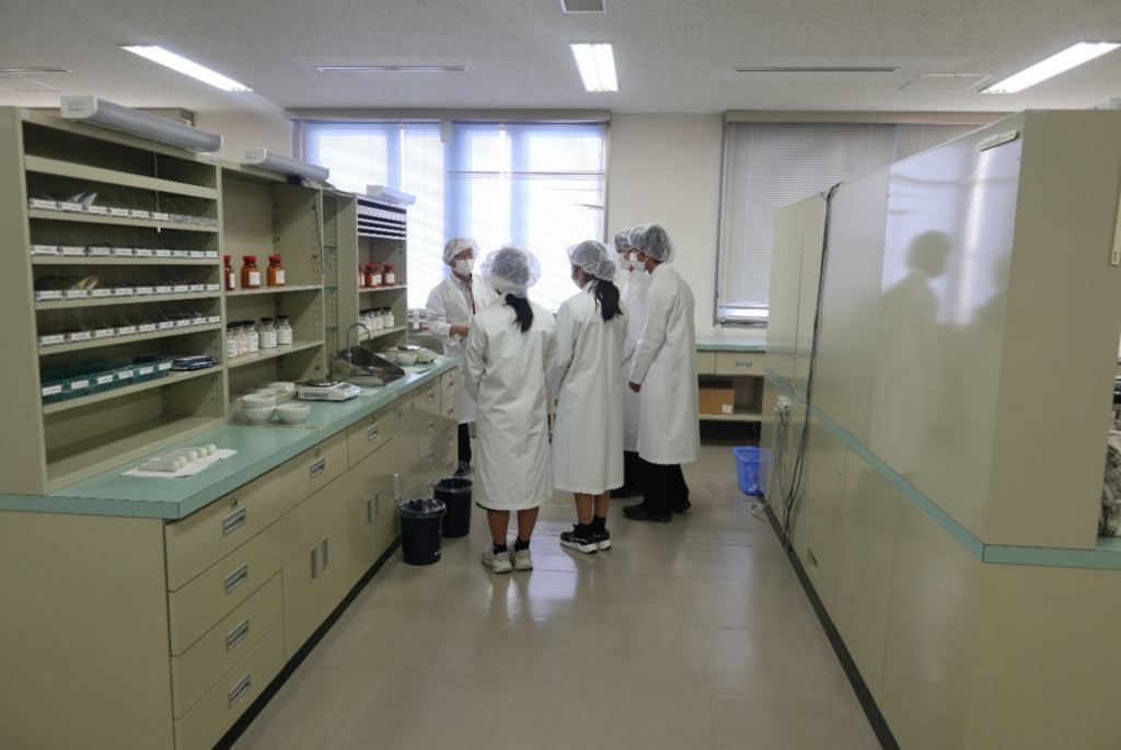 大学と薬学部の説明、講義室、研究室の見学後、薬剤学講座 上井優一准教授による薬学部での学びの説明、白衣に着替えて、模擬処方箋をもとにした調剤体験をしました。
