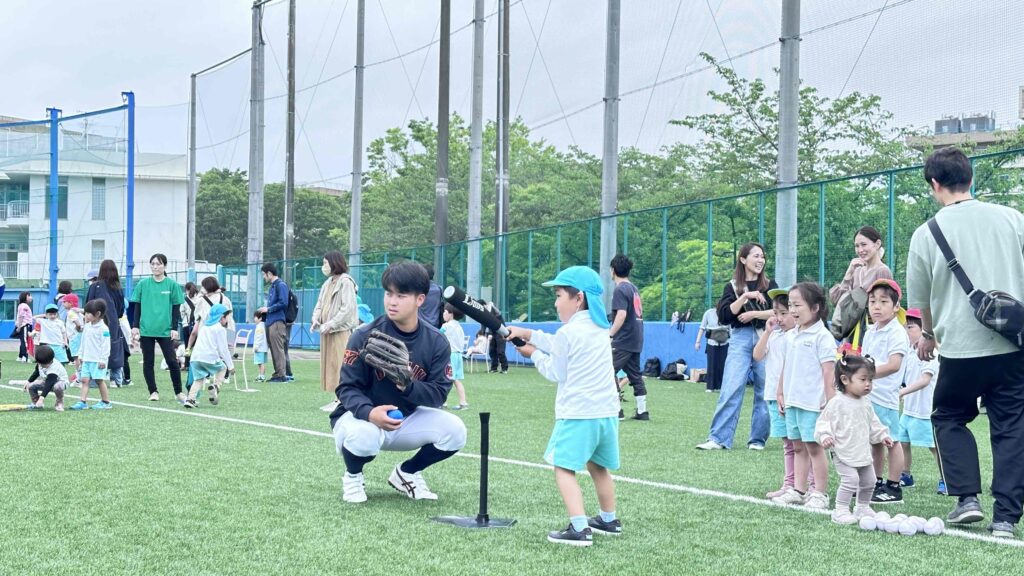 今回の野球教室は、保育園に通う5歳児に野球の楽しさ、面白さを知ってもらうことを目的とし、本学の硬式野球部員が補助役としてお手伝いをさせていただきました。