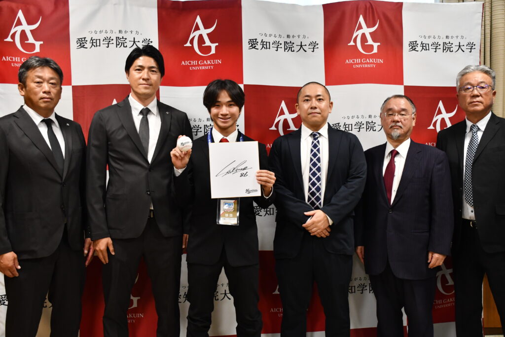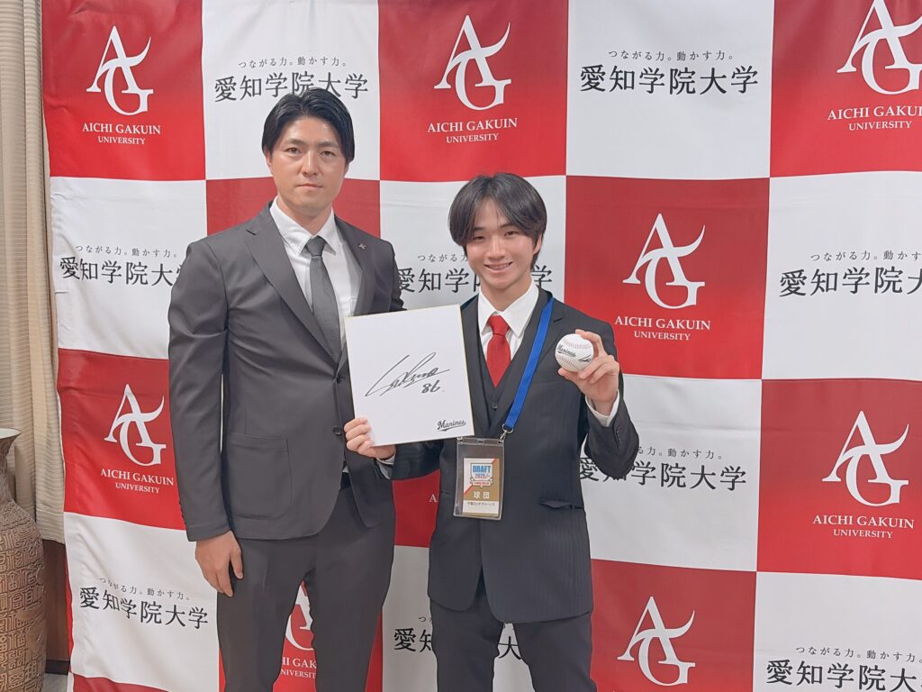 10月23日に行われたプロ野球ドラフト会議2025にて千葉ロッテマリーンズより育成3位指名を受けた杉山諒選手(心理学部心理学科4年生)が球団より指名挨拶を受けました。