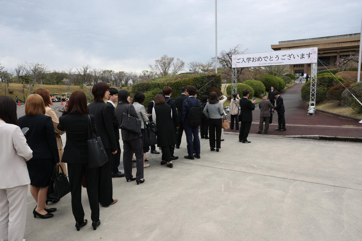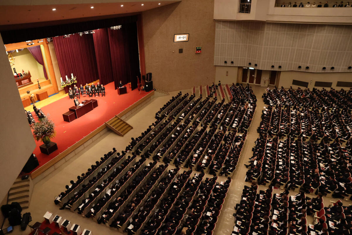 一千本もの満開の桜が咲き誇る4月1日(水)の朝、令和8年度入学式が午前・午後の二部制で愛知学院大学日進キャンパス100周年記念講堂にて盛大に挙行されました。午後からは雨模様となりましたが、今年度は、期待に満ち溢れた学部生2,932名(短大含む)・大学院生44名(歯学部と薬学部を除く)の新入生を新たに迎え入れました。また、広い講堂だけでなく、サテライト会場にて大勢の保護者の方に見守られる中、真新しいスーツに身を包んだ新入生たちは緊張した様子を見せながらも、これからの大学生活への期待をにじませ、真剣に式辞や祝辞の言葉に耳を傾けていました。これからのキャンパスライフでの飛躍と活躍が期待されます。