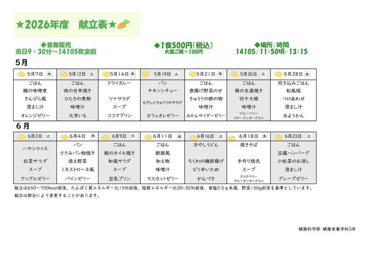2026年5月7日(木)より、6月23日(火)まで毎週火曜日と木曜日に健康栄養学科3年生による給食提供を行います。