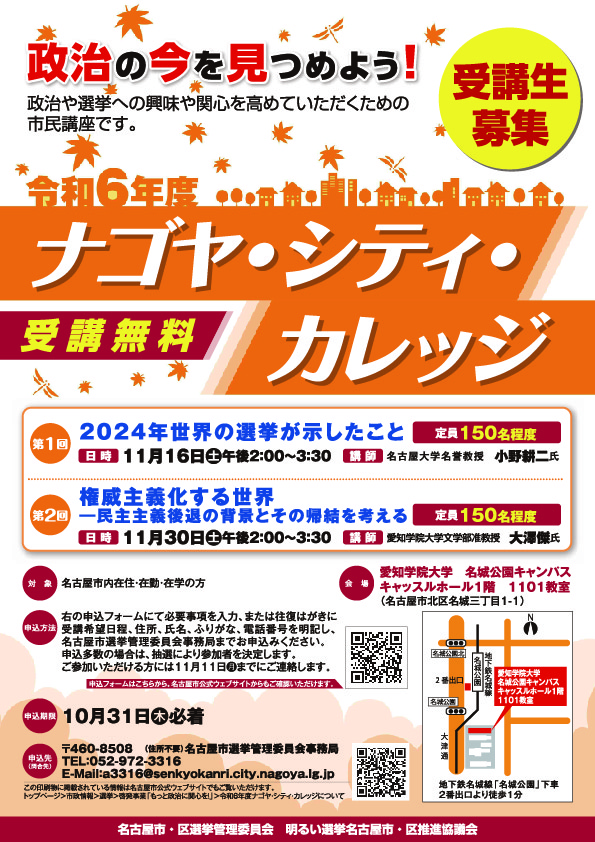 文学部 大澤 傑 准教授:ナゴヤ・シティ・カレッジ「権威主義化する世界ー民主主義後退の背景とその帰結を考える」(11/30)