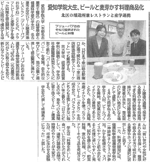 「中部経済新聞」掲載(11/15) 愛知学院大生、ビールと麦芽かす料理商品化