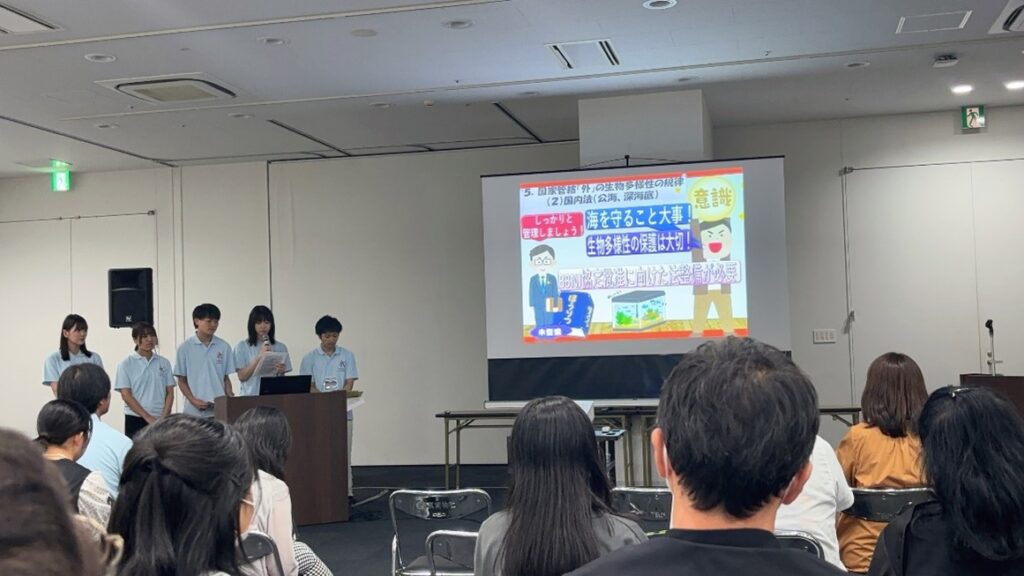 また、SDGsに取り組む大学を対象として行われた「大学生の取り組み発表会」にて、計7大学の代表学生がそれぞれ取り組んでいる内容について発表の場が設けられました。本学は法学部尋木ゼミの取り組みについて、「国際法に基づく海洋生物の活用と保全 ~深海魚のまち「蒲郡」の可能性~」をテーマに発表しました。発表後には、国際連合地域開発センター所長・遠藤和重さん、みんなのSDGsナビゲーター・クリス・グレンさんによる質問や講評がありました。
